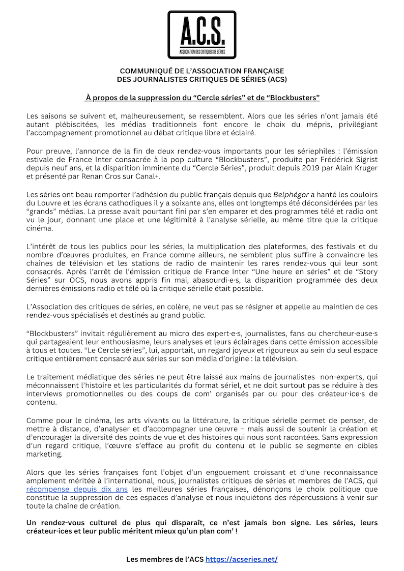 Alors que les séries françaises font l’objet d’un engouement croissant et d’une reconnaissance amplement méritée à l’international, nous, journalistes critiques de séries et membres de l’ACS, qui récompense depuis dix ans les meilleures séries françaises, dénonçons le choix politique que constitue la suppression de ces espaces d’analyse et nous inquiétons des répercussions à venir sur toute la chaîne de création.
